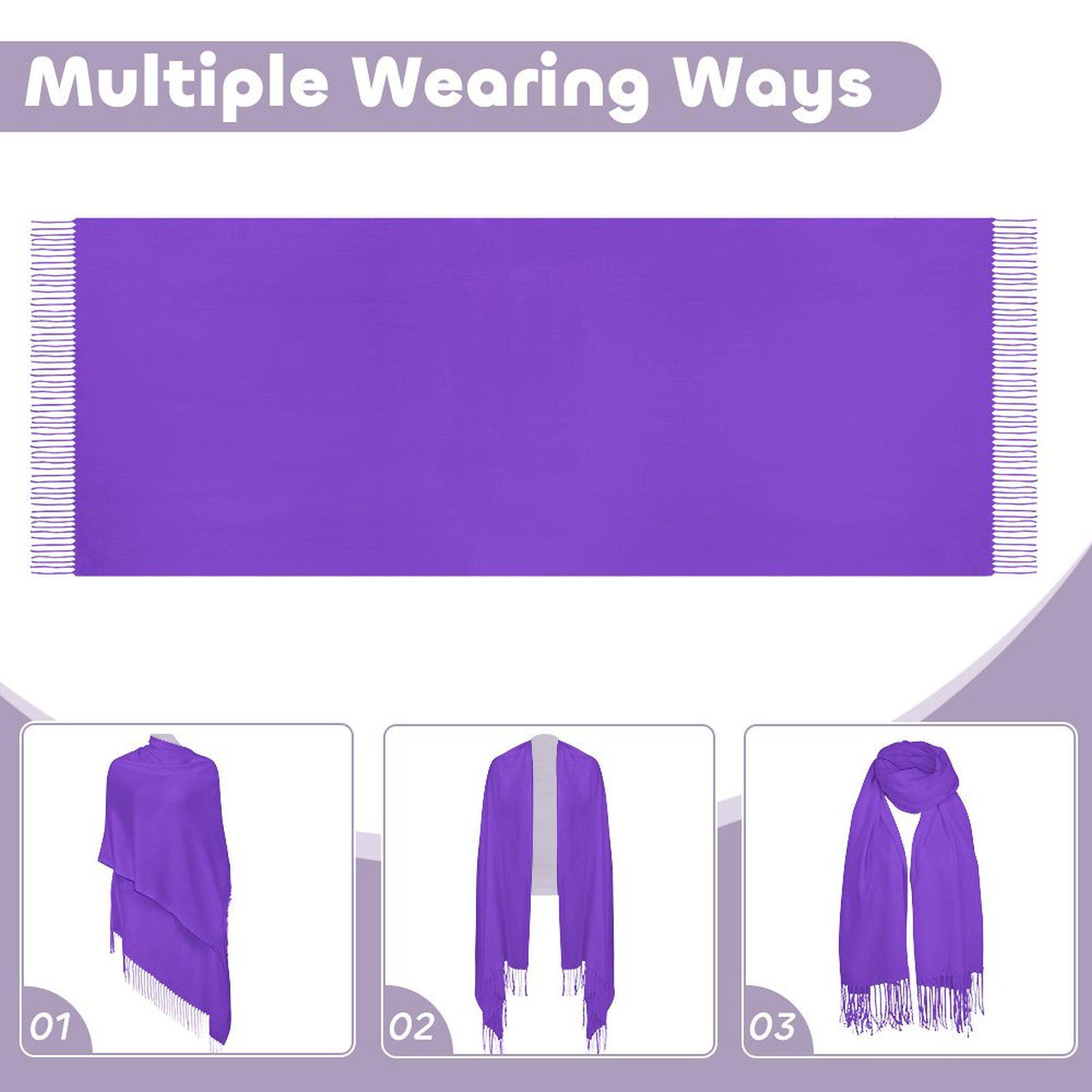 Wear it three ways: draped as an asymmetrical shawl for evening elegance, wrapped traditionally as a cozy scarf for daily wear, or styled as a poncho-like wrap for bohemian flair. The rich purple adds a pop of color to neutral outfits.