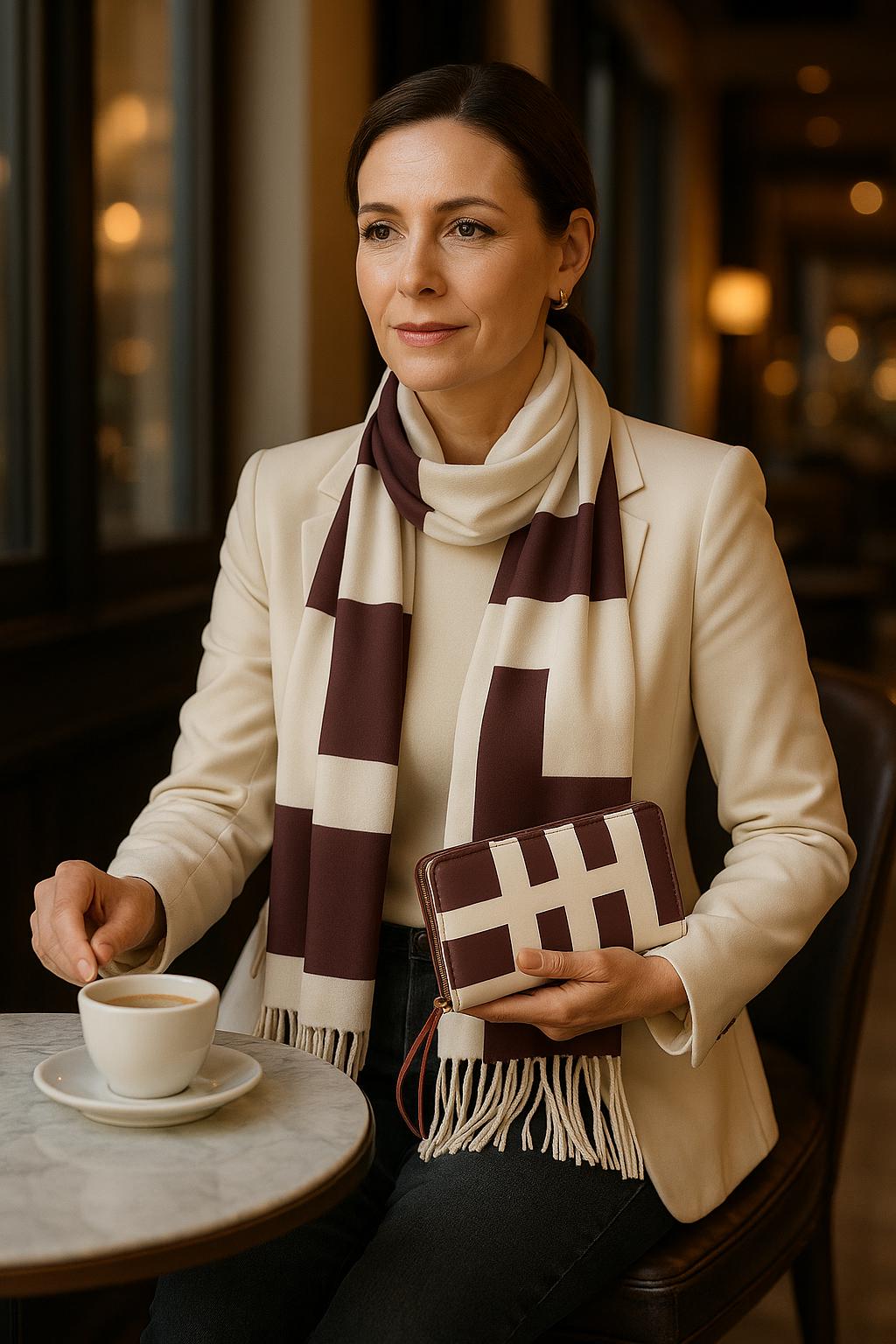 This modern check pattern is perfect for adding visual interest to solid colors. Pair with a wine-colored top to pull out the burgundy tones, or wear with cream and beige for a tonal look. The geometric pattern makes it a conversation starter while remaining sophisticated enough for professional settings.